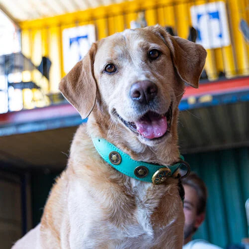 ❤︎ Exklusives Design: das Halsband präsentiert sich in lebhaftem Türkis mit einer weichen, braunen Lederinnenseite, die Komfort und Stil geschmackvoll kombiniert.