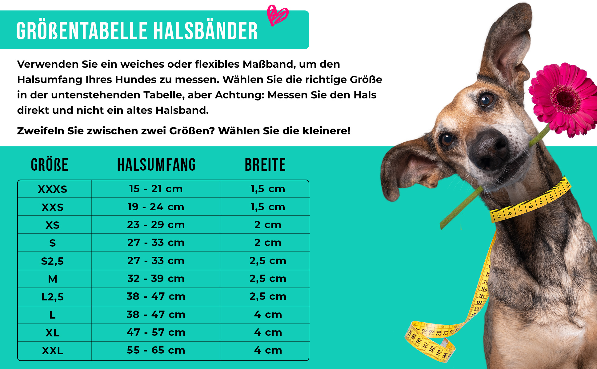 Achtung: Messen Sie immer den Hals Ihres Hundes, nicht das alte Halsband. Unsere Größen sind einzigartig und basieren auf dem Halsumfang.