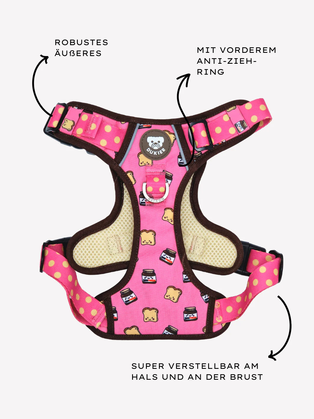 Ihr Anti-Zieh-Design und die Festigkeit ihrer Materialien machen sie zum perfekten Geschirr für die wildesten Spaziergänge.
