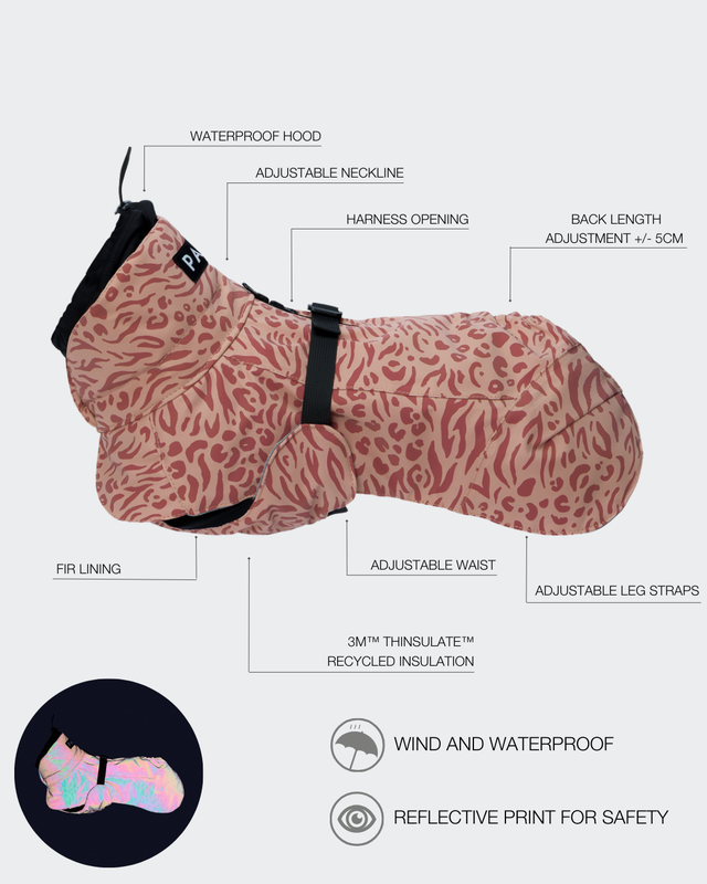 Trotzen Sie der Kälte mit PAIKKA. Die leichte 3M™ Thinsulate™-Isolierung sorgt für Wärme und besteht zu 78 % aus recycelten Materialien. Das Ferninfrarot-Futter (FIR) kann bei der Muskelvorbereitung und -regeneration helfen. Das charakteristische reflektierende Material garantiert Sichtbarkeit und Sicherheit bei Outdoor-Abenteuern, während das 100 % wasserdichte Gewebe mit verschweißten Nähten Ihren Hund trocken hält. Mehrere Einstellpunkte sorgen für die perfekte Passform für alle Hunde.